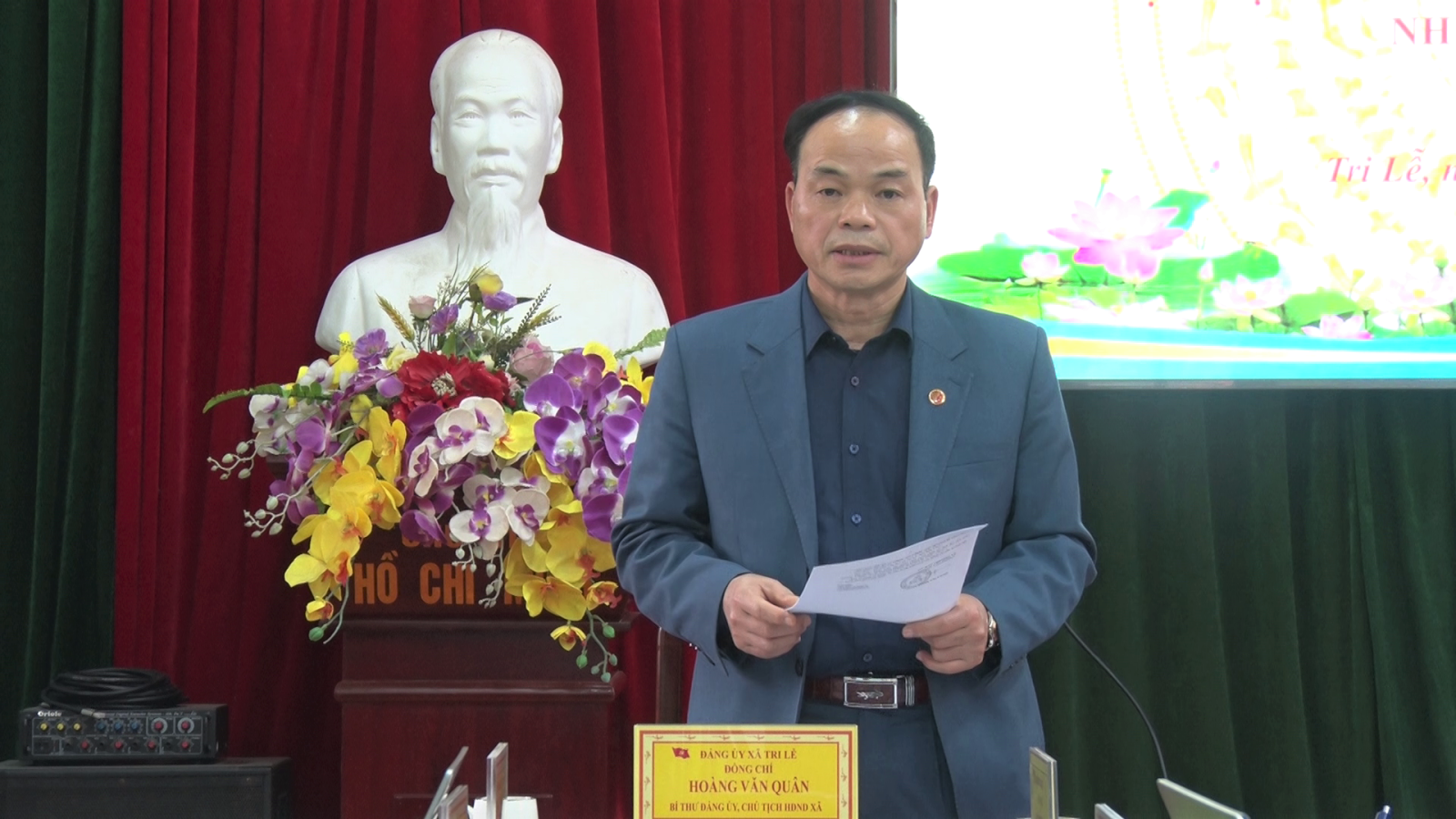 Đồng chí Hoàng Văn Quân, Bí thư Đảng ủy, Chủ tịch HĐND xã phát biểu tại hội nghị