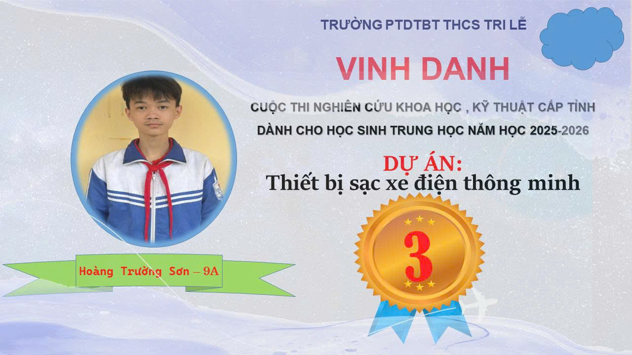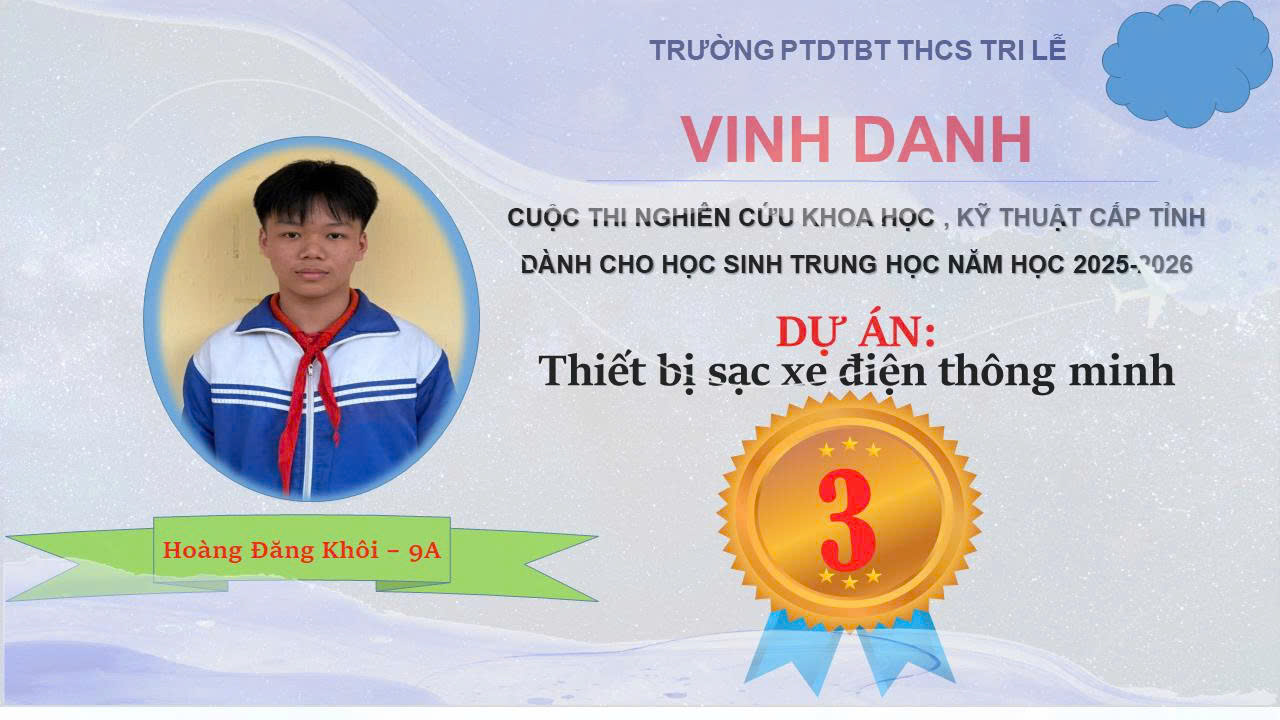 1- Giải Ba cấp tỉnh: Dự án “Thiết bị sạc xe điện thông minh ”. Dự án do hai em: Hoàng Trường Sơn và Hoàng Đăng Khôi - Lớp 9A thực hiện, dưới sự hướng dẫn của thầy giáo Hoàng Hải Nam, giáo viên môn Tin học. Dự án đã thiết kế và chế tạo một thiết bị sạc xe điện thông minh có khả năng phát hiện sớm các nguy cơ cháy nổ trong quá trình sạc pin lithium, từ đó ngắt nguồn chủ động, giảm thiểu rủi ro cho người dùng và cộng đồng. Đồng thời, dự án hướng đến việc ứng dụng công nghệ IoT để tạo ra một hệ thống sạc hiện đại, có thể giám sát – cảnh báo – quản lý từ xa, phù hợp với xu thế phát triển hạ tầng xe điện an toàn và bền vững.