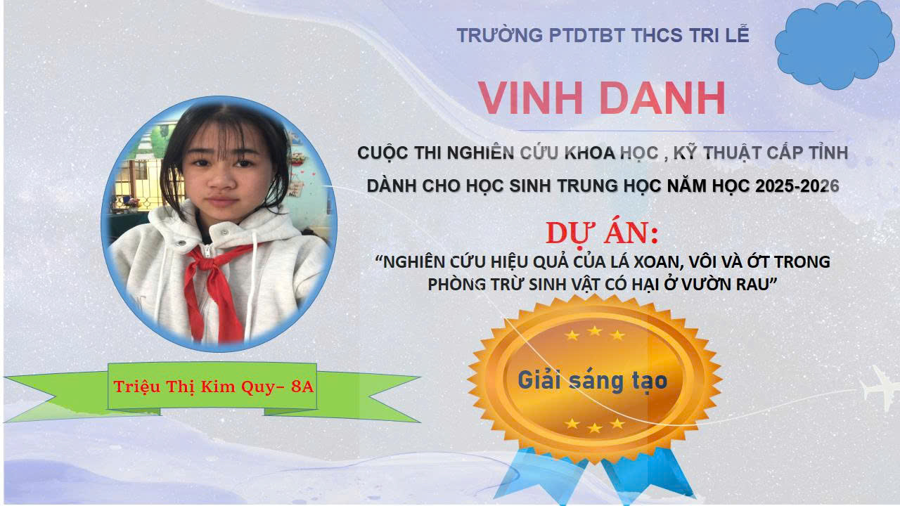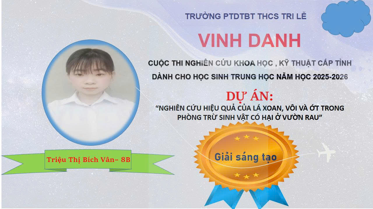 2- Giải “Sáng tạo khoa học”. Dự án "Nghiên cứu hiệu quả của lá xoan, vôi và ớt trong phòng trừ sinh vật có hại ở vườn rau", do 02 em học sinh: Triệu Kim Quy - Lớp 8A và Triệu Thị Bích Vân -Lớp 8B dưới sự hướng dẫn của thầy giáo La Khí Thế, giáo viên môn Sinh học. Dự án đã đề xuất giải pháp sử dụng hỗn hợp tự nhiên thay thế thuốc bảo vệ thực vật trong chăm sóc rau tại hộ gia đình và cộng đồng.