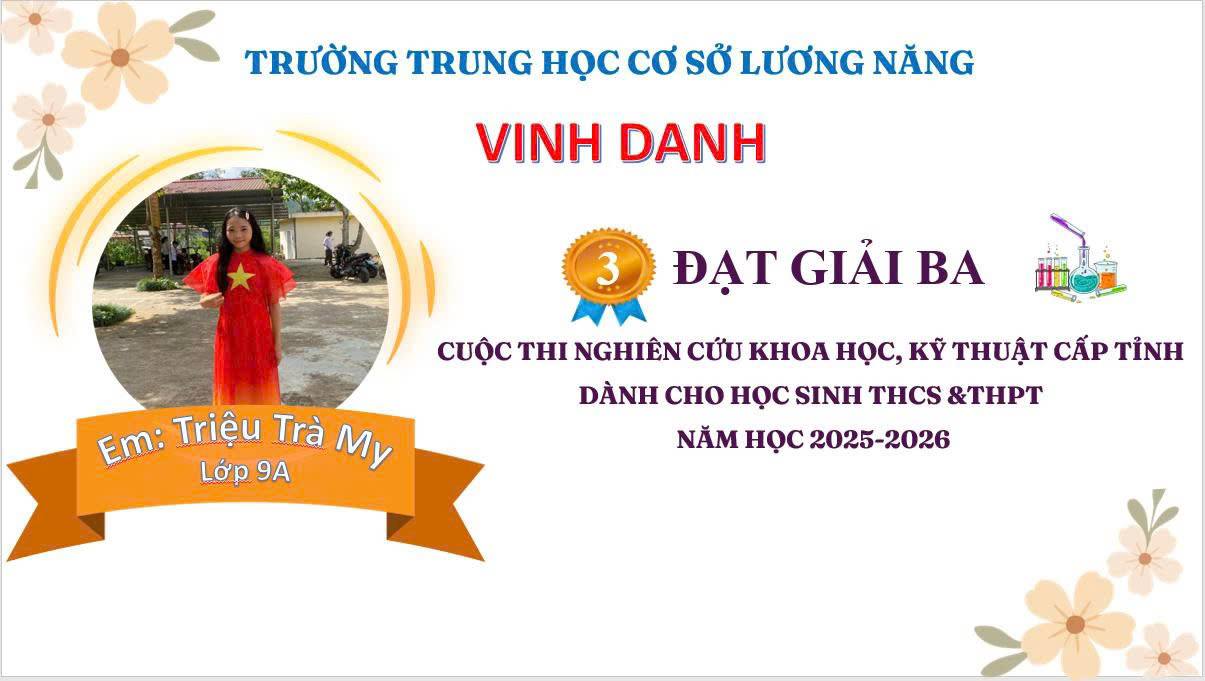 2. Trường THCS Lương Năng – có 01 sản phẩm đạt giải Ba cấp tỉnh, với Dự án: “Nghiên cứu thành phần hóa học, tác dụng dược lí và quy trình bào chế cao xoa bóp từ hạt gấc (Momordica cochinchinensis)” do 02 em Triệu Trà My lớp 9A và Linh Mạnh Chuyên - Lớp 8 thực hiện. Dưới sự hướng dẫn của cô giáo Vi Thị Bích Hảo, Dự án đã xây dựng thành công quy trình chiết xuất hoạt chất từ hạt Gấc bằng dầu dừa và bào chế hoàn thiện sản phẩm cao xoa bóp, có độ an toàn tuyệt đối, không gây kích ứng và đạt hiệu quả giảm đau, tan bầm tím rõ rệt trên 80% người sử dụng. Qua đó, đề tài chứng minh tính khả thi và giá trị thực tiễn trong việc tận dụng phụ phẩm hạt Gấc để phát triển các sản phẩm chăm sóc sức khỏe xanh, hiệu quả và thân thiện với môi trường.