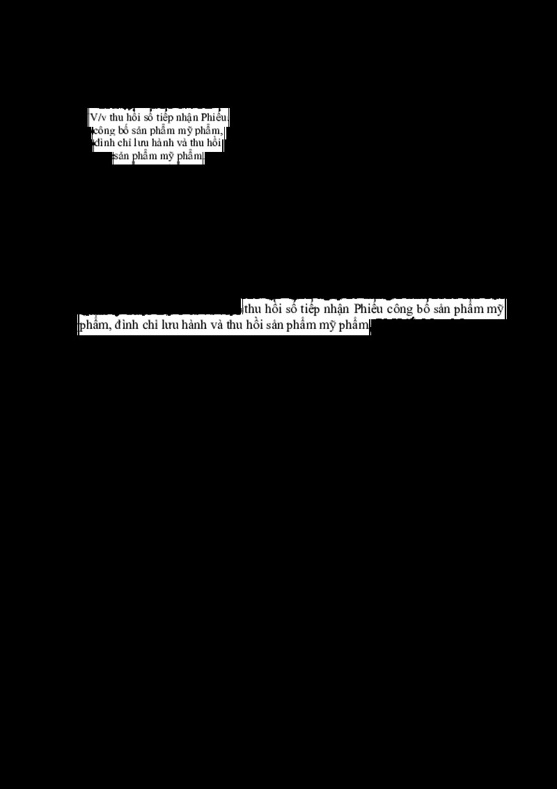 | Tiêu đề văn bản | công văn về việc thu hồi số tiếp nhận Phiếu công bố sản phẩm mỹ phẩm, đình chỉ lưu hành và thu hồi sản phẩm mỹ phẩm | ||